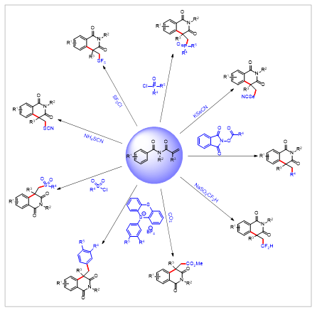 N-acryloylbenzamides with carbon-, sulfur-, phosphorus-, selenium-, and other radical precursors. The mechanistic features and synthetic applications of key transformations, including alkylation, fluoroalkylation, acylation, arylation, sulfonylation, are discussed in detail. Finally, the review provides an outlook on current challenges and perspective developments in this rapidly evolving field.