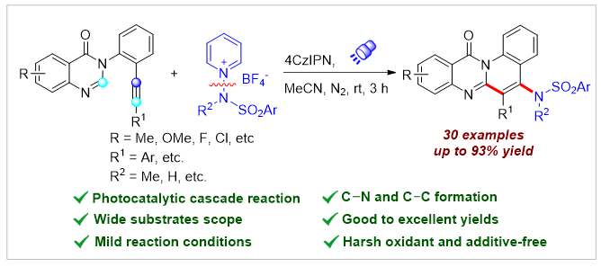 Visible-Light-Driven Radical Amination/Cyclization of Arylethynyl Quinazolinones to Access Sulfonaminated Quinolino[2,1-b]quinazolines
